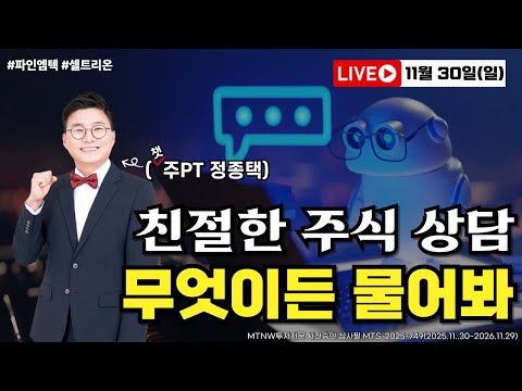 #종목상담 #파인엠텍 #셀트리온 #애플 #신약 #제약종목 상담부터 승부주 공개까지 친절한 주식 상담 라이브! 챗주PT에게 무엇이든 물어봐! [20251130 주말라이브]▶정종택 무료 카톡방https://open.kakao.com/o/gKN47EEh▶정종택 어드바이저 가입하기https://www.mtnw.co.kr/live/join/202506271502499005SP▶MTNW투자자문 유튜브 구독하기 / @mtn_w ▶MTN 머니투데이 방송 홈페이지https://mtn.co.kr/▶MTN 패밀리 채널을 구독하세요! 부자되는 좋은 습관 대한민국 경제채널 MTN / @mtn▶정종택 어드바이저의 MTNW 무료 카톡방 https://open.kakao.com/o/gKN47EEh #오피파라다이스